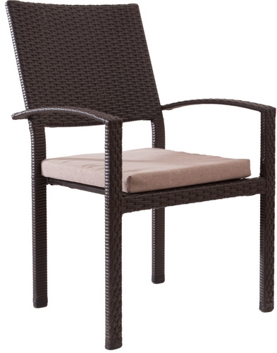 Кресло Парма с стальным каркасом и оплёткой из искусственного ротанга коричневого цвета. Размеры изделия (ДхШхВ): 58 х 65 х 95 см. Размеры сиденья (ДхШ): 44 х 44 см. В комплекте с креслом идёт мягкая подушка бежевого цвета.
