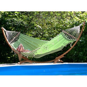 Гамак устойчивый и удобный благодаря поперечным деревянным перекладинам.