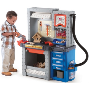 Игровой комплекс состоит из: большой рабочей поверхности с выемками для болтов и гаек, выдвижных ящиков и подвесных баночек для хранения инструментов, пылесоса, тисков, подсветки и набора аксессуаров из 50 предметов (детали из пенополистирола для моделирования, дрель, болты, гайки, пила, молоток, плоскогубцы, отвертка и пр.).