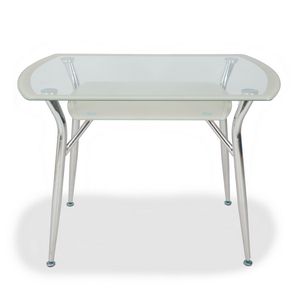 Ножки выполнены из хромированного металла, столешница из закаленного и устойчивого к царапинам стекла с бежевой окантовкой.