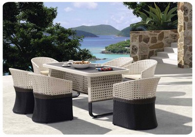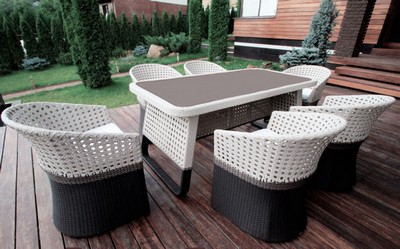 Комплект мебели Сrocodile 202140 (Крокодил) стол + 6 кресел имеет необычный дизайн опор кресел. Они глухо оплетены, что создает эффект целостности и подчеркивает высоту сидений. Стол обладает стеклянной столешницей, она не боится ударов посуды.